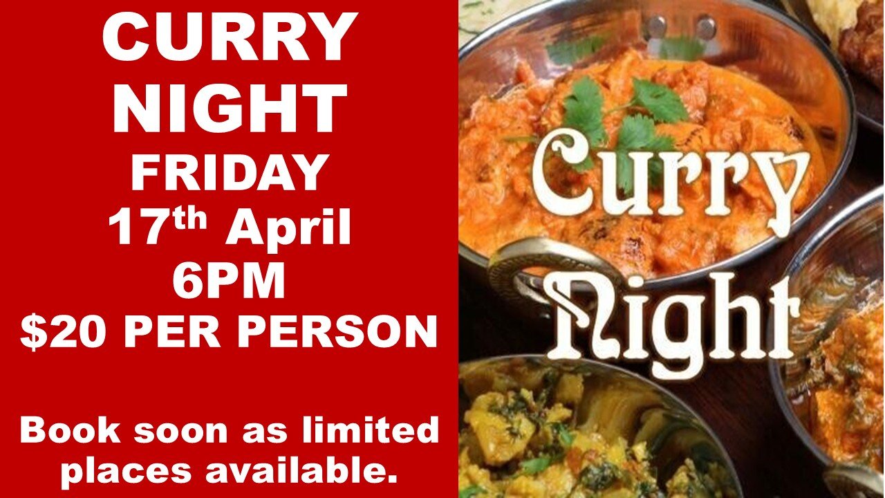 Don't miss our first Curry Night for the year. All Saints Anglican Church, 501 Hamilton Road, Chermside. The fun begins at 6pm on Friday 17th April and the cost is only $20 per person.